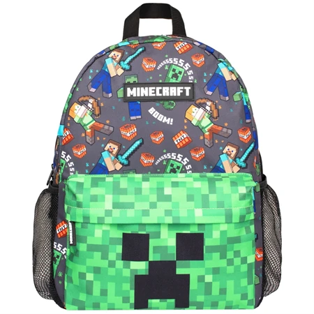 Mega sej Minecraft rygsæk fra Fringoo. Tasken er med stort rum bagerst samt lomme indvendig. Den har et mindre rum med lynlås foran og små net rum på begge sider til drikkedunk eller småting. Stropperne kan justeres og tasken er lavet i vandafvisende mate
