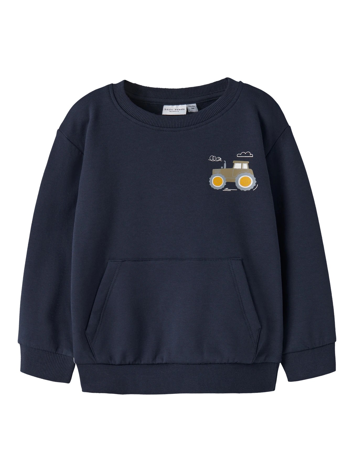 Mega sej sweatshirt fra Name It med en cool traktor på maven. Sweatshirten har kænguru lomme foran og ribkanter ved hænder og nederst på blusen.